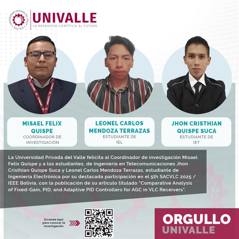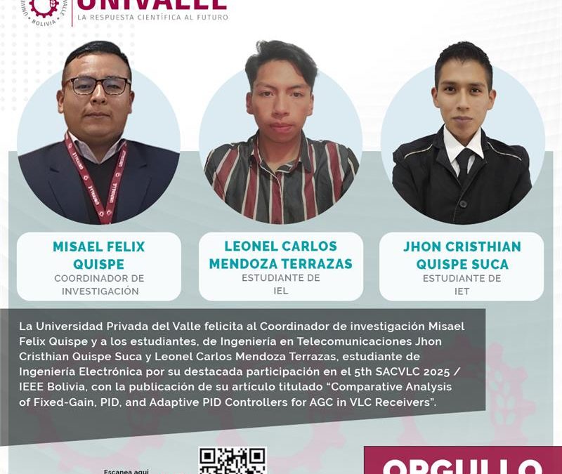 El artículo, titulado “Comparative Analysis of Fixed-Gain, PID, and Adaptive PID Controllers for AGC in VLC Receivers”, fue presentado en la 5th South American Conference on Visible Light Communication (SACVLC 2025), organizada por IEEE Bolivia y UNIVALLE, consolidando el liderazgo de nuestra universidad en el ámbito de la investigación científica en América Latina.